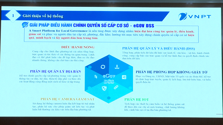 Giải pháp điều hành chính quyền số cấp cơ sở (A Smart Platform for Local Governance) là nền tảng được xây dựng nhằm hiện đại hóa công tác quản lý, điều hành, giám sát và phục vụ người dân tại cấp xã, phường, đặc khu; hướng tới mục tiêu xây dựng chính quyền số cấp cơ sở hiệu quả, minh bạch và lấy người dân làm trung tâm. Hệ thống gồm 6 phân hệ: điều hành nóng, quản lý và điều hành (DSS), quản lý địa bàn, phòng họp không giấy tờ, camera giám sát, IoT.
