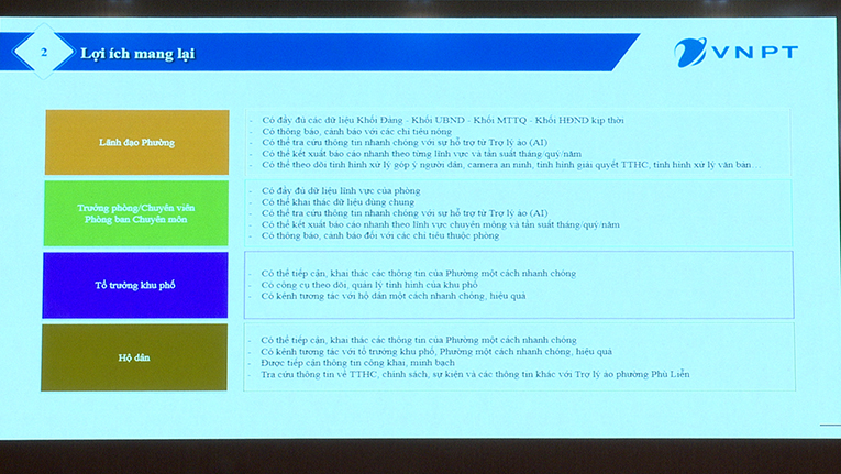 Hệ thống thực hiện xử lý thông tin được tạo lập từ các đơn vị chuyên ngành, hình thành hệ thống dữ liệu về kinh tế - xã hội phục vụ ra quyết định chính sách, hỗ trợ công tác quản lý, điều hành đảm bảo thống nhất, hiệu quả của Đảng uỷ, HĐND, UBND, Uỷ ban Mặt trận Tổ quốc Việt Nam phường.