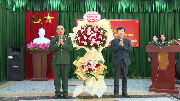 Đồng chí Phạm Tiến Thắng – Phó Bí thư Thường trực Đảng ủy phường tặng hoa chúc mừng Hội Cựu chiến binh phường