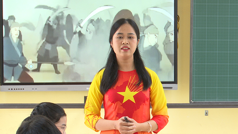 Tiết học được tổ chức sinh động, sáng tạo, thể hiện rõ hiệu quả của việc ứng dụng công nghệ số trong dạy học. Ngay từ phần khởi động với bài hát “Hào khí Đông A”, không khí lớp học trở nên hào hứng, khơi gợi tinh thần yêu nước và niềm tự hào dân tộc cho học sinh. Trong phần luyện tập, học sinh được ôn tập kiến thức về triều Trần thông qua sơ đồ tư duy, trình bày và chia sẻ các dự án học tập về những nhân vật lịch sử tiêu biểu như Chu Văn An, Trần Quốc Toản bằng nhiều hình thức phong phú: thuyết trình, video, hoạt cảnh sân khấu hóa.