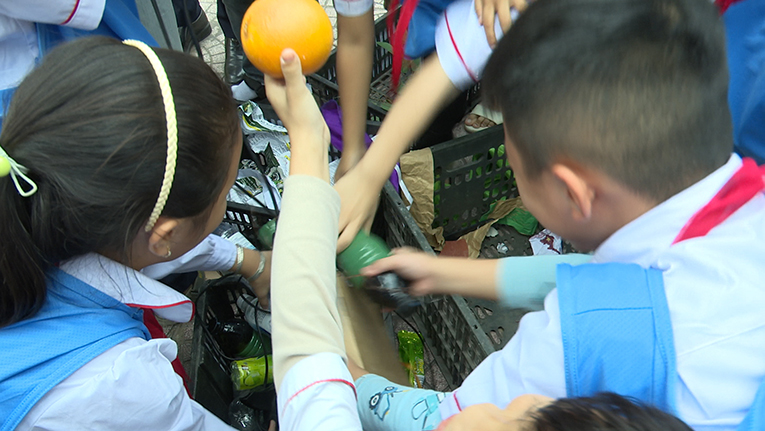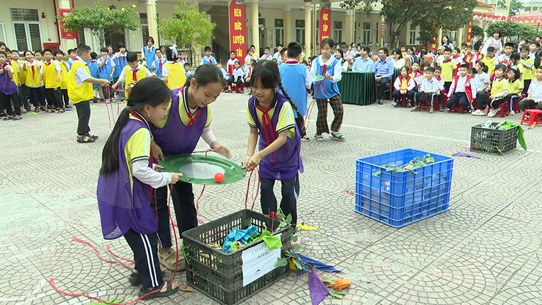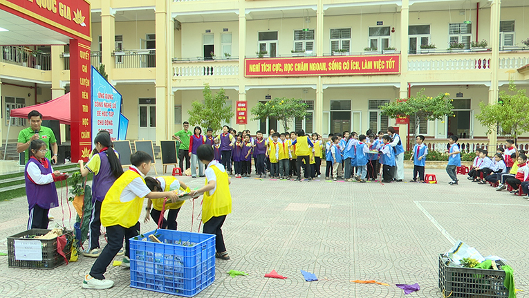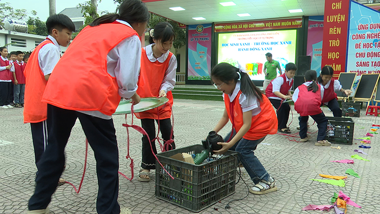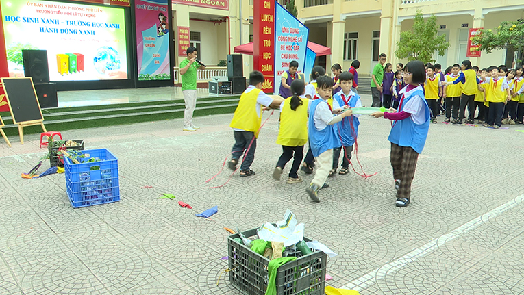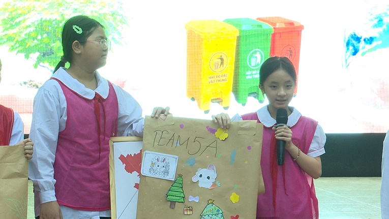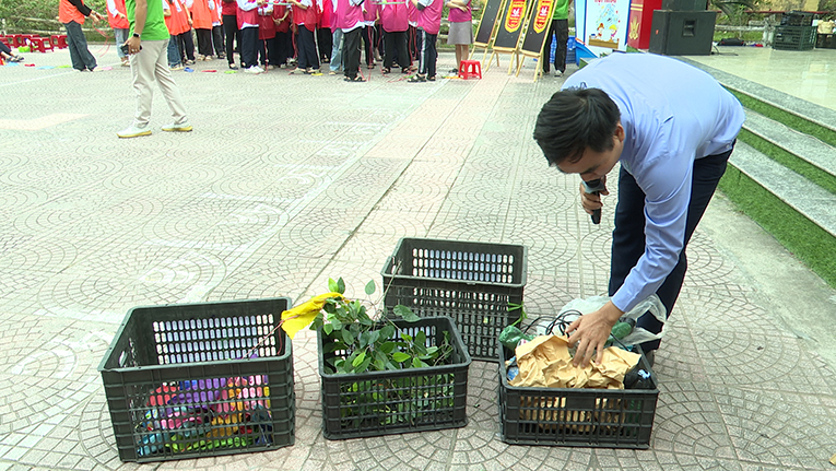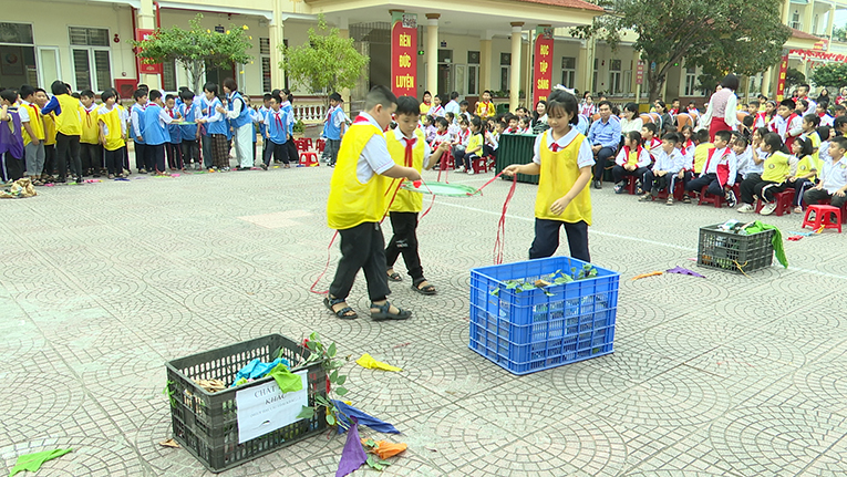 Không khí chương trình trở nên sôi nổi hơn khi học sinh tham gia phần thi thu gom rác. Các đội phải phối hợp di chuyển chiếc mâm đựng rác về đúng điểm đặt, vừa vận động vừa ghi nhớ quy tắc thu gom đúng nơi – đúng loại. Tiếng hò reo cổ vũ và sự phối hợp nhịp nhàng giữa các thành viên đã tạo nên tinh thần thi đua tích cực.