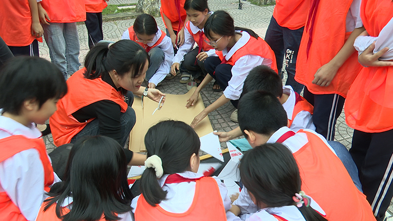 Các em học sinh tham gia các trò chơi thực hiện các nhiệm vụ thu gom rác, phân loại rác, tái chế sản phẩm từ giấy, ghép bản đồ Việt Nam