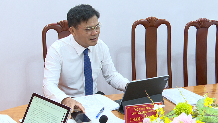 Đồng chí Phạm Văn Diện - Phó Bí thư Đảng ủy, Chủ tịch UBND phường phát biểu tại hội nghị