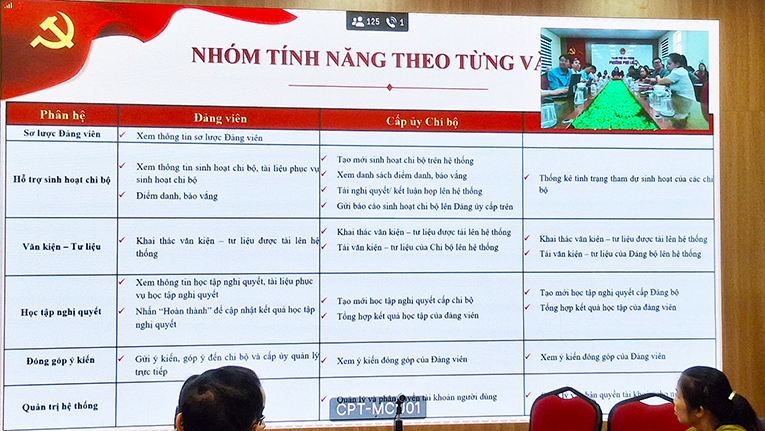 Tại hội nghị, các đại biểu được giới thiệu tổng quan về ứng dụng “Sổ tay đảng viên điện tử” và hướng dẫn chi tiết các thao tác, cách sử dụng, khai thác các tiện ích của ứng dụng ở cả hai vai trò: cấp ủy và đảng viên.
