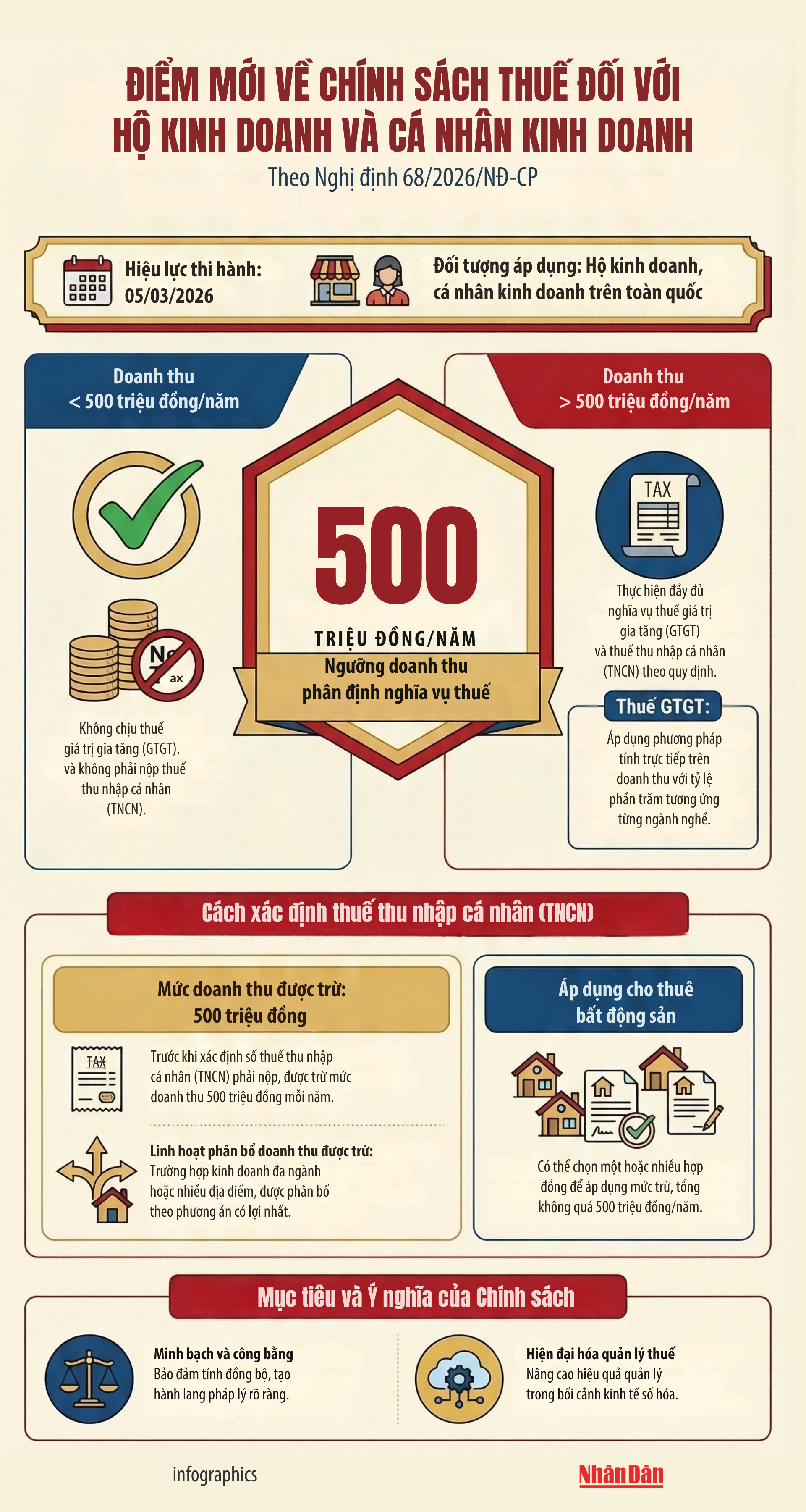 Chính phủ vừa ban hành Nghị định 68/2026/NĐ-CP quy định về chính sách và quản lý thuế đối với hộ, cá nhân kinh doanh. Với ngưỡng doanh thu không chịu thuế lên tới 500 triệu đồng/năm, quy định mới nhằm tạo hành lang pháp lý minh bạch, đồng bộ và bảo đảm công bằng trong nghĩa vụ thuế.