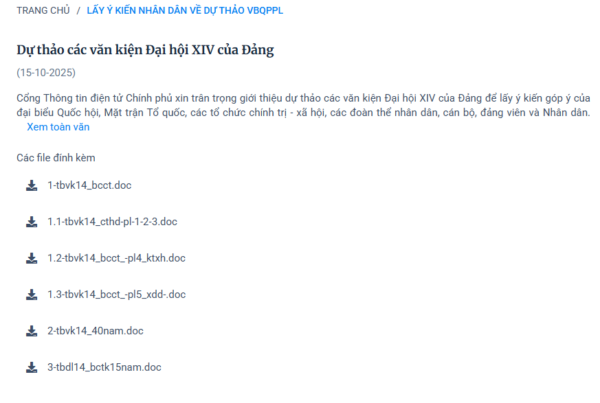 Cổng Thông tin điện tử Chính phủ xin trân trọng giới thiệu dự thảo các văn kiện Đại hội XIV của Đảng để lấy ý kiến góp ý của đại biểu Quốc hội, Mặt trận Tổ quốc, các tổ chức chính trị - xã hội, các đoàn thể nhân dân, cán bộ, đảng viên và Nhân dân. Xem toàn văn