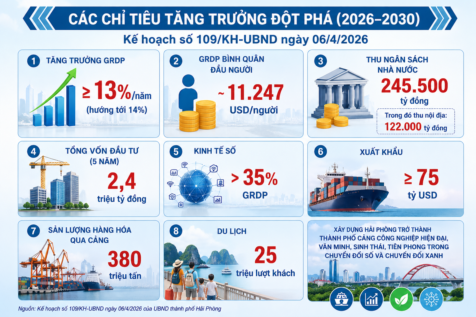 Kế hoạch số 109/KH-UBND đặt ra những chỉ tiêu kinh tế - xã hội quan trọng nhằm hiện thực hóa định hướng đưa Hải Phòng tiệm cận các thành phố tiêu biểu trong khu vực Đông Nam Á. Cụ thể, trong giai đoạn 2026 - 2030, thành phố phấn đấu tốc độ tăng trưởng GRDP bình quân đạt từ 13%/năm trở lên, mục tiêu vươn tới mức 14%/năm.
