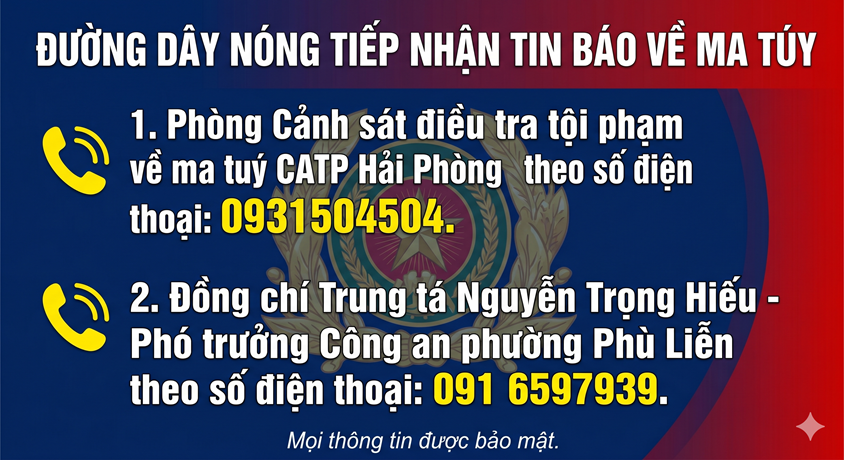 1. Phòng Cảnh sát điều tra tội phạm về ma tuý CATP Hải Phòng theo số điện thoại: 0931504504.