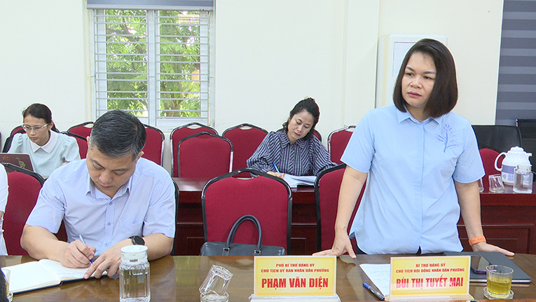 Đồng chí Bùi Thị Tuyết Mai – Bí thư Đảng ủy, Chủ tịch HĐND phường báo cáo việc bàn giao, sử dụng vườn hoa Phù Liễn và thực tế hệ thống kênh mương thủy lợi trên địa bàn phường