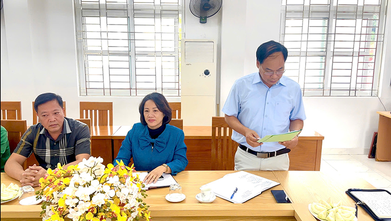 Nhà giáo Phạm Văn Xình - Hiệu trưởng trường Tiểu học Lê Hồng Phong báo cáo tại buổi giám sát