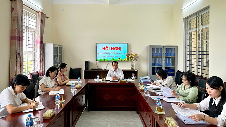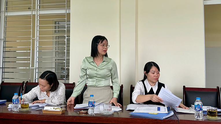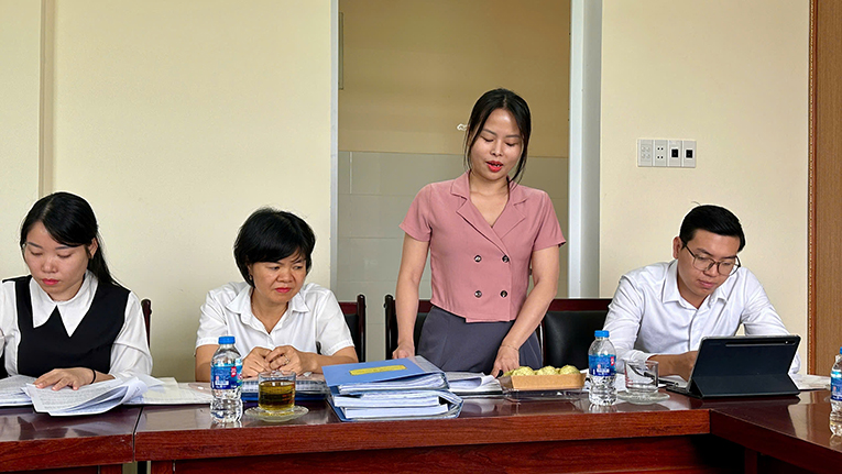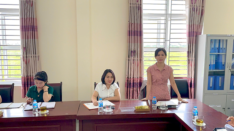 Nhà giáo Bùi Thị Thoa - Hiệu trưởng trường mầm non Văn Đẩu báo cáo tại buổi giám sát