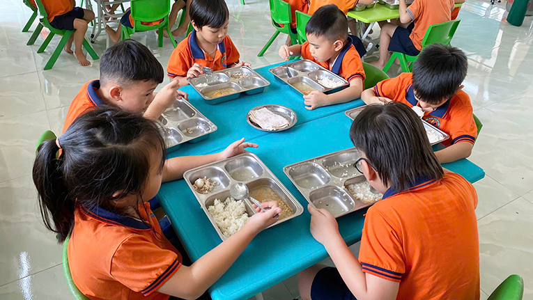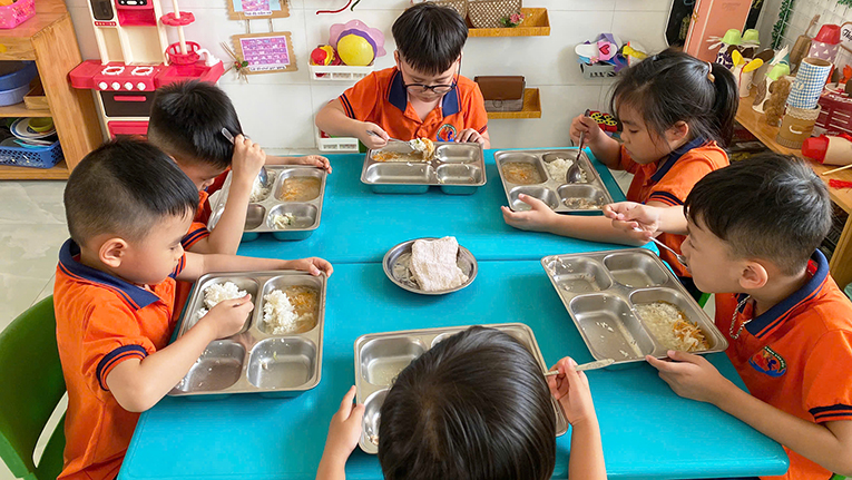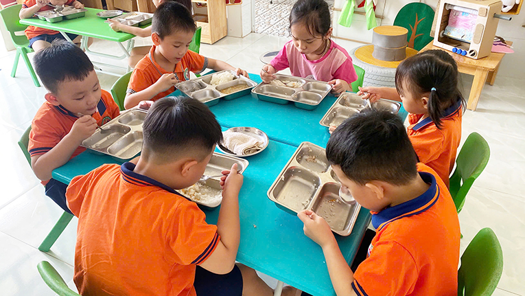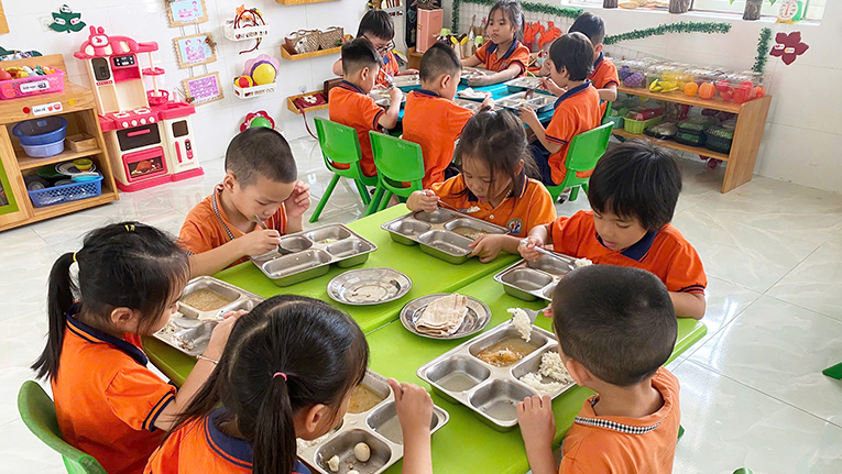 Nhà trường có đội ngũ nhân viên nuôi dưỡng được tập huấn kiến thức an toàn thực phẩm, nắm vững quy trình chế biến và bảo quản thực phẩm, ứng dụng công nghệ thông tin trong hoạt động thiết kế thực đơn và định lượng dưỡng chất, đảm bảo bữa ăn của trẻ ngon miệng, đủ lượng, đủ chất, an toàn. Tại trường không xảy ra sự cố mất an toàn thực phẩm. Bên cạnh đó, công tác tuyên truyền, phối hợp với phụ huynh được duy trì thường xuyên, góp phần nâng cao nhận thức, hình thành thói quen vệ sinh và ăn uống khoa học cho trẻ.