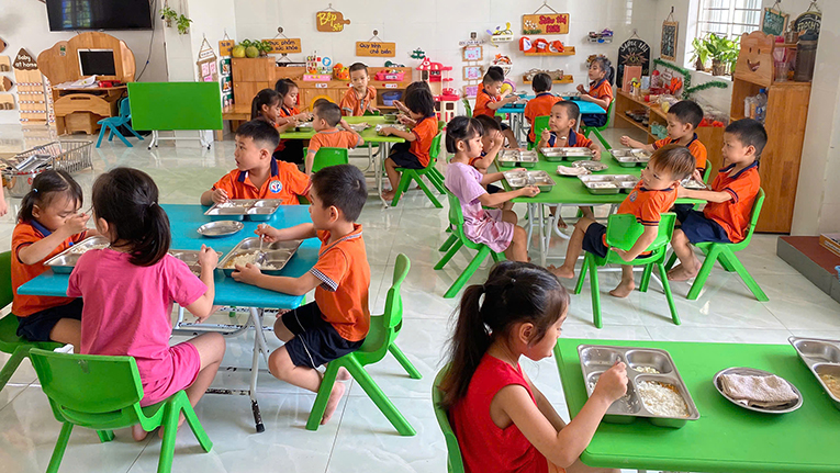 Các em học sinh trường Mầm non Văn Đẩu ăn bán trú tại trường