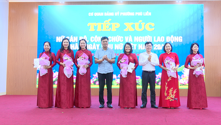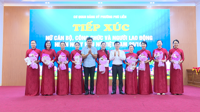 Đồng chí Phạm Tiến Thắng - Phó Bí thư Thường trực Đảng ủy phường; đồng chí Phạm Văn Diện - Phó Bí thư Đảng ủy, Chủ tịch Ủy ban nhân dân phường tặng hoa, tặng quà chúc mừng các đồng chí nữ lãnh đạo, cán bộ, công chức, viên chức, người lao động cơ quan Đảng ủy phường nhân kỷ niệm Ngày Phụ nữ Việt Nam 20/10