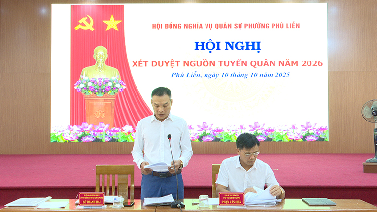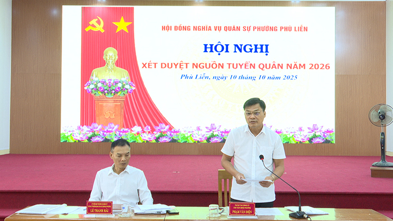 Ngày 10/10, Hội đồng Nghĩa vụ quân sự phường Phù Liễn tổ chức hội nghị xét duyệt nguồn tuyển quân năm 2026. Dự hội nghị có đồng chí Bùi Thị Tuyết Mai – Bí thư Đảng ủy, Chủ tịch HĐND phường; đồng chí Phạm Văn Diện - Phó Bí thư Đảng ủy, Chủ tịch UBND phường; đồng chí Phạm Tiến Thắng - Phó Bí thư Thường trực Đảng ủy phường. Cùng dự có lãnh đạo Uỷ ban Mặt trận Tổ quốc Việt Nam phường, đại diện Ban chỉ huy phòng thủ khu vực 1 – Gia Viên.