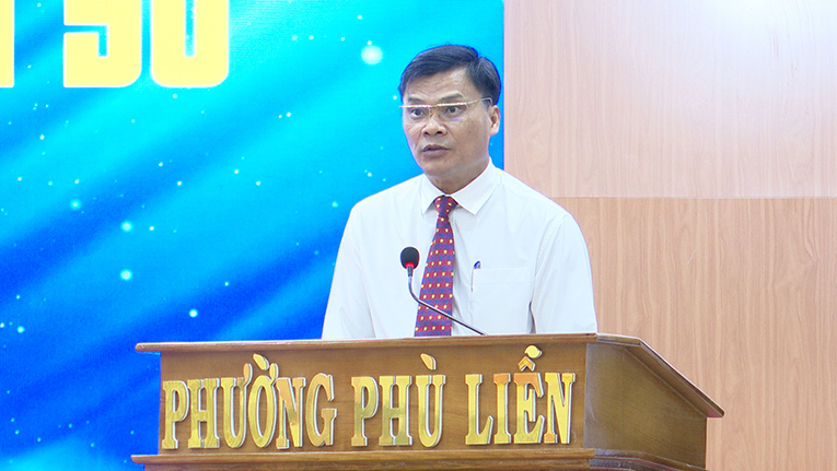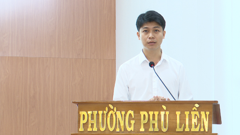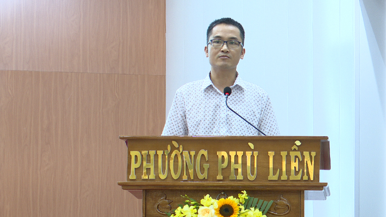 Đồng chí Phạm Văn Diện – Phó Bí thư Đảng ủy, Chủ tịch UBND phường báo cáo đề dẫn về chuyển đổi số trong giáo dục của các trường Tiểu học, Trung học cơ sở đang sử dụng các thiết bị hiện có khi thao tác kỹ năng số cơ bản