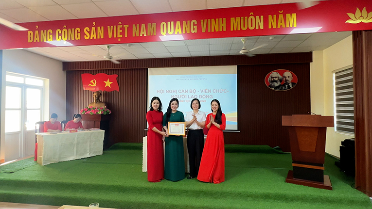 Đồng chí Trịnh Thị Kim Hoa – Đảng ủy viên, Trưởng phòng Văn hóa – Xã hội phường trao giấy khen tặng 7 cán bộ, giáo viên nhà trường đạt danh hiệu Chiến sĩ thi đua cấp cơ sở năm học 2024-2025