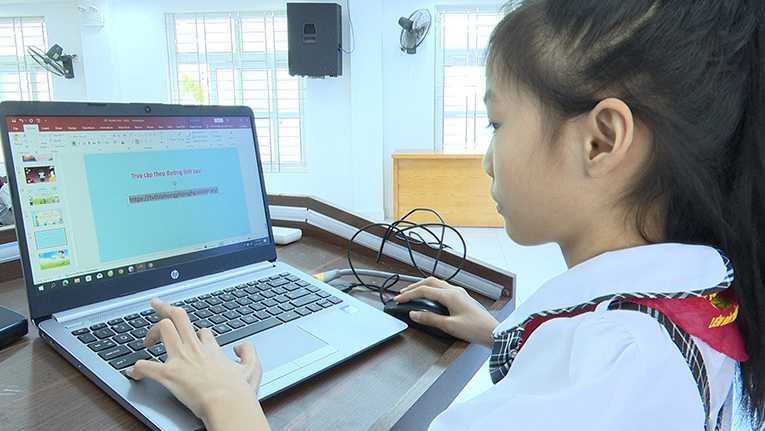 Học sinh nhà trường thao tác khai thác thư viện số của nhà trường