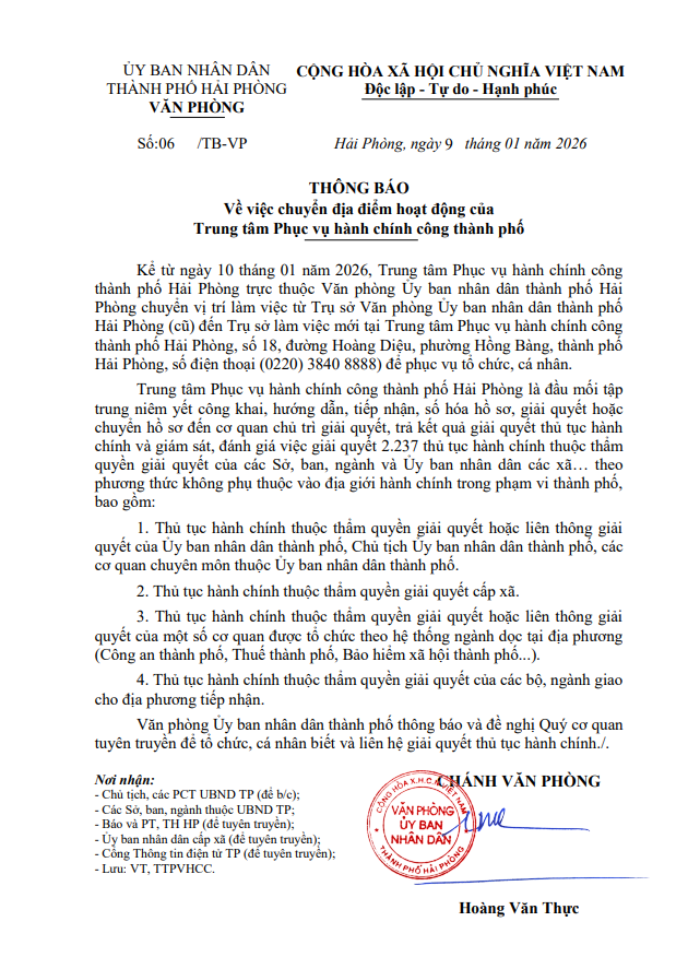 Kể từ ngày 10 tháng 01 năm 2026, Trung tâm Phục vụ hành chính công thành phố Hải Phòng trực thuộc Văn phòng Ủy ban nhân dân thành phố Hải Phòng chuyển vị trí làm việc từ Trụ sở Văn phòng Ủy ban nhân dân thành phố Hải Phòng (cũ) đến Trụ sở làm việc mới tại Trung tâm Phục vụ hành chính công thành phố Hải Phòng, số 18, đường Hoàng Diệu, phường Hồng Bàng, thành phố Hải Phòng, số điện thoại (0220) 3840 8888) để phục vụ tổ chức, cá nhân.
